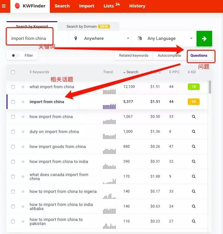 上文中,其实我们已经提到过这个软件了,之前主要是用于关键词研究,在这里我们要说的是它的话题研究功能。点击“Question”选项,输入关键词,我们就可以看到与之相关的问题以及搜索量