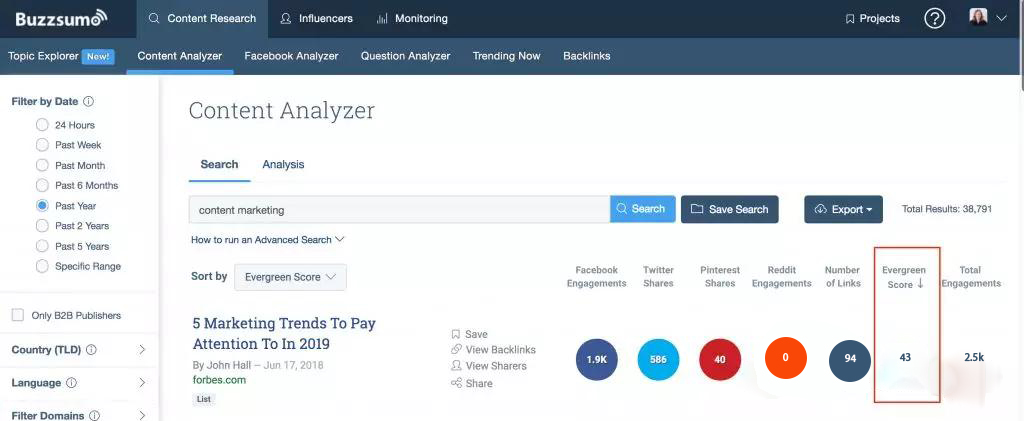 BuzzSumo和Ahrefs这两种工具,都提供话题研究功能。在BuzzSumo上面,你还可以对相应话题的文章进行排序,找出其中最热门或最吸引人的文章。