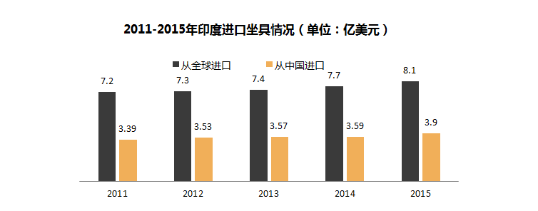 从海关数据可以看到,印度对进口坐具的需求逐年递增,平均增幅12.5%,2015年,自中国进口的坐具占坐具总进口额的48.1%,是第一大进口来源国。