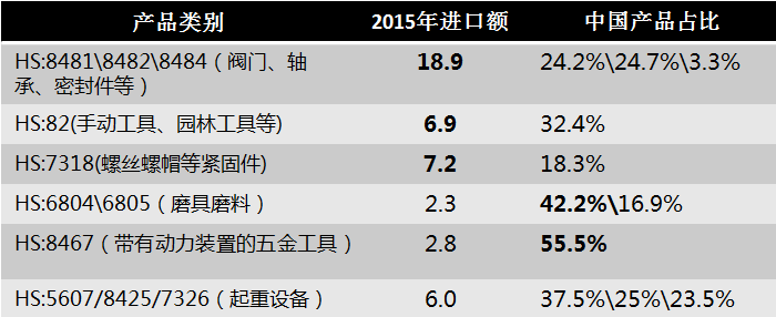 五金工具涉及的重点产品进口情况(海关代码)--单位:亿美元