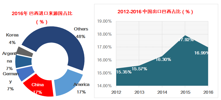 •同时,2012年中国货物出口巴西占比为15.35%,2016年攀升至16.99%。