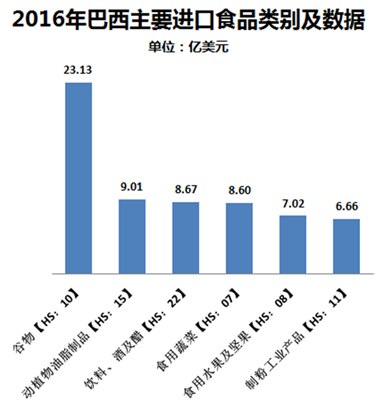 •巴西进口量最多的为谷物,其次为动植物油脂制品、饮料酒水及醋、食用蔬菜、食用水果、罐头产品及坚果等。