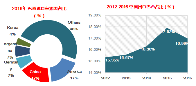 •同时,2012年中国货物出口巴西占比为15.35%,2016年攀升至16.99%。