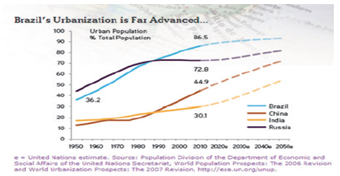 世界银行发布的2013年《世界发展指标》报告显示,金砖国家中城镇化率最高的是巴西,近85%。联合国预测,到2050年,巴西的城镇化率有望达到90.7%。