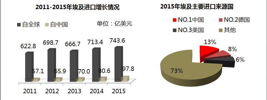 近年来,中埃政府积极鼓励和推动双方企业扩大经贸合作,双边贸易额持续增长。2013年,中埃贸易额首次突破百亿美元,达102.13亿美元。2014年,双边贸易额116.2亿美元,同比增长13.8%。
