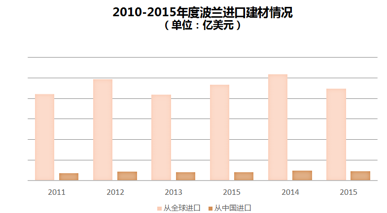 2015年波兰建材产品总进口数据高达89.9亿美元;自中国进口相关产品,高达9.6亿美元,占波兰总进口的10.7%。