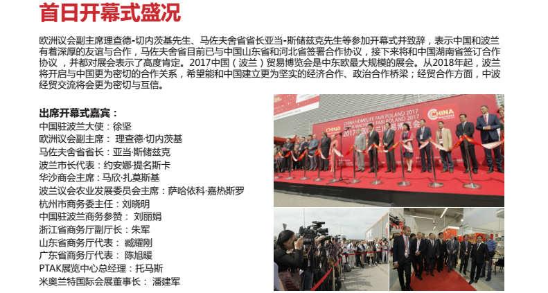 波兰展已成为波兰及周边国家买家最看中的采购平台之一,得到了海外政府等合作单位的大力支持。中国驻波兰大使徐坚先生、欧洲议会副主席理查德·切内茨基先生,马佐夫舍省省长亚当·斯储兹克先生、杭州市商务委主任刘晓明先生,中国驻波兰商务参赞刘丽娟女士,浙江省商务厅副厅长朱军先生,山东省商务厅代表臧耀刚先生,广东省商务厅代表陈旭暖先生,米奥兰特国际会展董事长潘建军先生等重要领导出席展会开幕式。