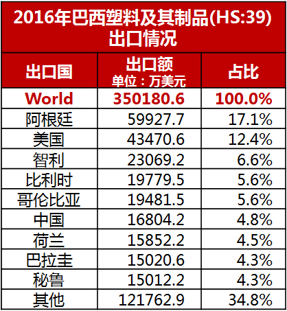 巴西是全球主要的塑料生产国之一,每年都要出口大量的塑料制品至大西洋和太平洋沿岸国家和地区,2016年出口额高达40.09亿美元,排名前三的出口国分别是阿根廷、美国和智利。