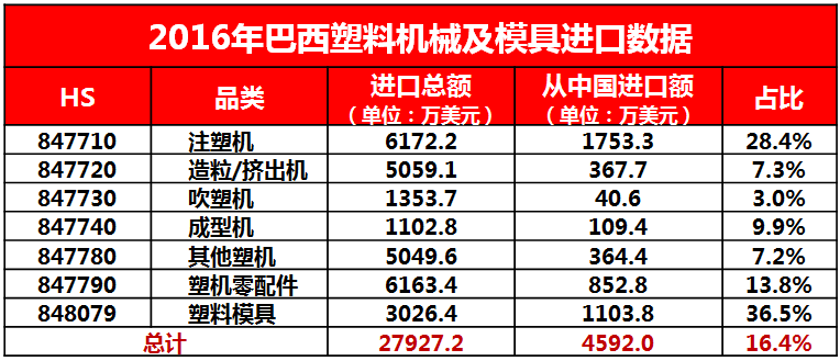 2、巴西主要进口的塑料机械包括“注塑机、造粒/挤出机及其他塑机”,对塑料模具的市场需求也较为巨大。