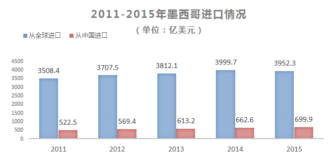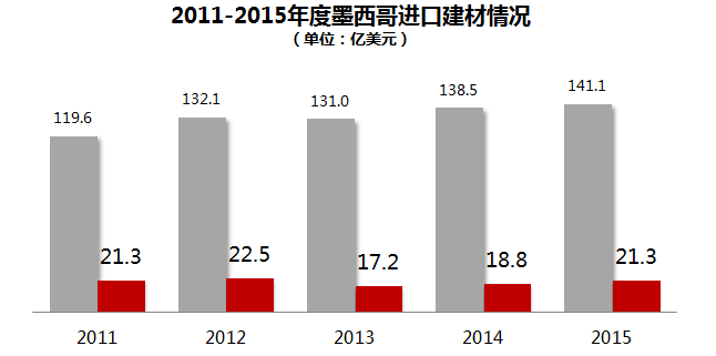 2015年墨西哥建材产品总进口数据高达141.1亿美元;自中国进口相关产品,高达21.3亿美元,占墨西哥总进口的15.06%。