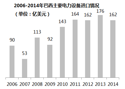 巴西对电力能源设备需求自2010年起需求稳定在160亿美元以上,2013更是达到峰值176亿美元。