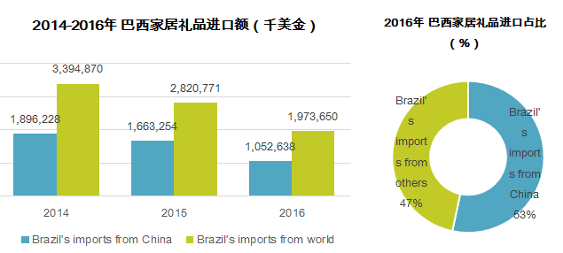 巴西对中国的家居礼品依赖度高。中国是巴西最主要的家居礼品进口地,2016年巴西从中国进口家居礼品价值10.52亿美元,占总进口比例接近53%,并且近几年都保持着较高的依赖水平。