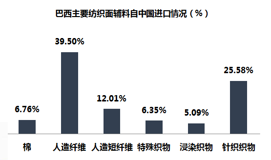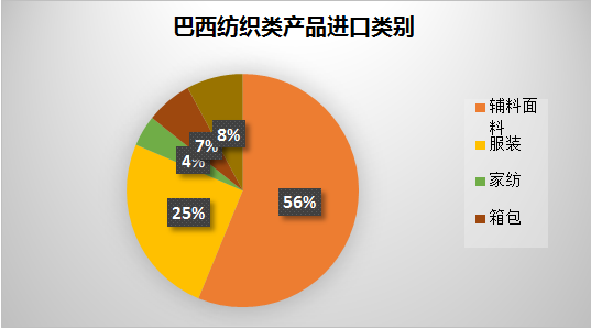 巴西进口纺织类产品中,辅料面料占56%,服装类占25%,鞋类占8%,箱包类7%,家纺类4%。