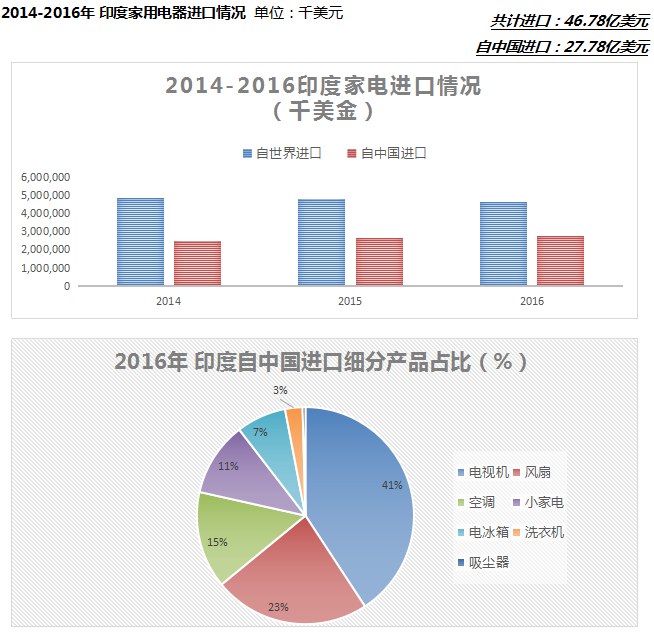 2016年印度进口家用电器共计46.78亿美元,其中自中国进口额高达27.78亿美元,占比59.4%,成为印度家居家用电器的第一来源国。2017年印度的零售业预计将达到4500亿美元,与意大利相仿,是巴西的2倍。随着习主席“一路一带”建设推进和印度莫迪新政府推行的一系列“中国式改革”,未来几年将是中印贸易合作的最佳时期。