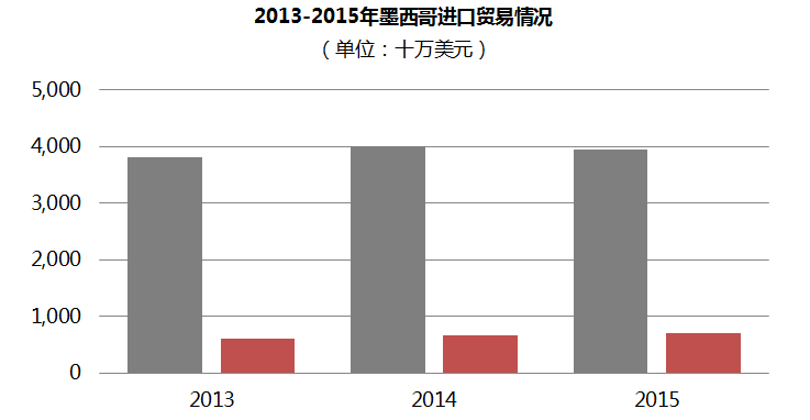 2015年墨西哥与中国的双边贸易额为748.7亿美元,增长3.6%。其中,自中国进口699.9亿美元,增长5.6%。