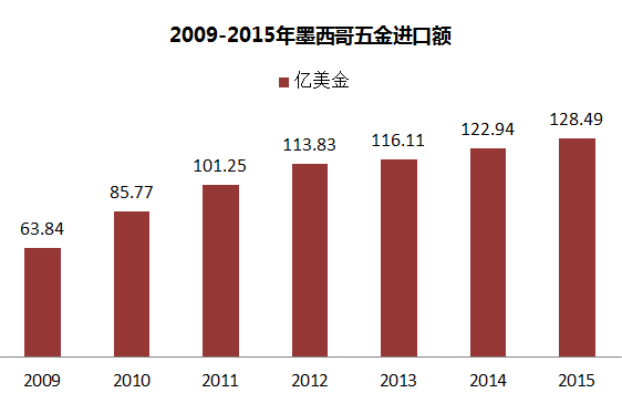 u墨西哥主要五金工具及部件进口需求庞大,近4年稳定在110亿美元以上,2015年达到近130亿美元。