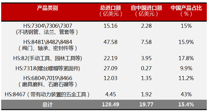 关于螺丝螺帽等紧固件产品,墨西哥需求较大,但是中国市场占有率仅10%,上升空间巨大。
