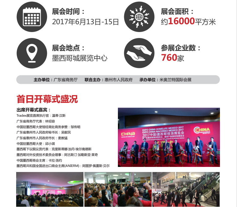 墨西哥展会得到国内外政府的支持,Tradex展览首席执行官温蒂汉斯、广东省商务厅代表林绍容、中国驻墨西哥大使馆经商处商务参赞邹传明、广东省惠州市人民政府秘书长吴献民、广东